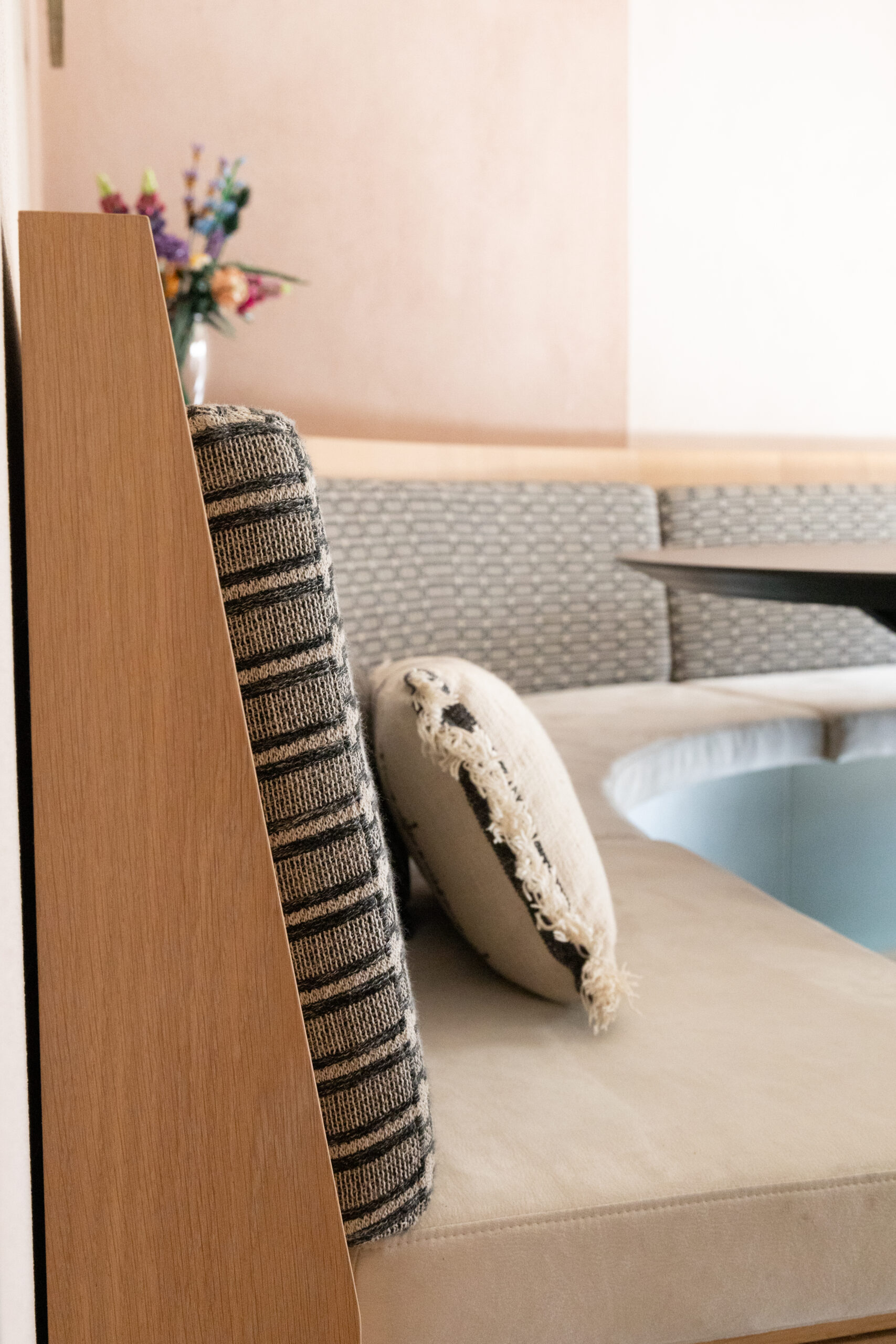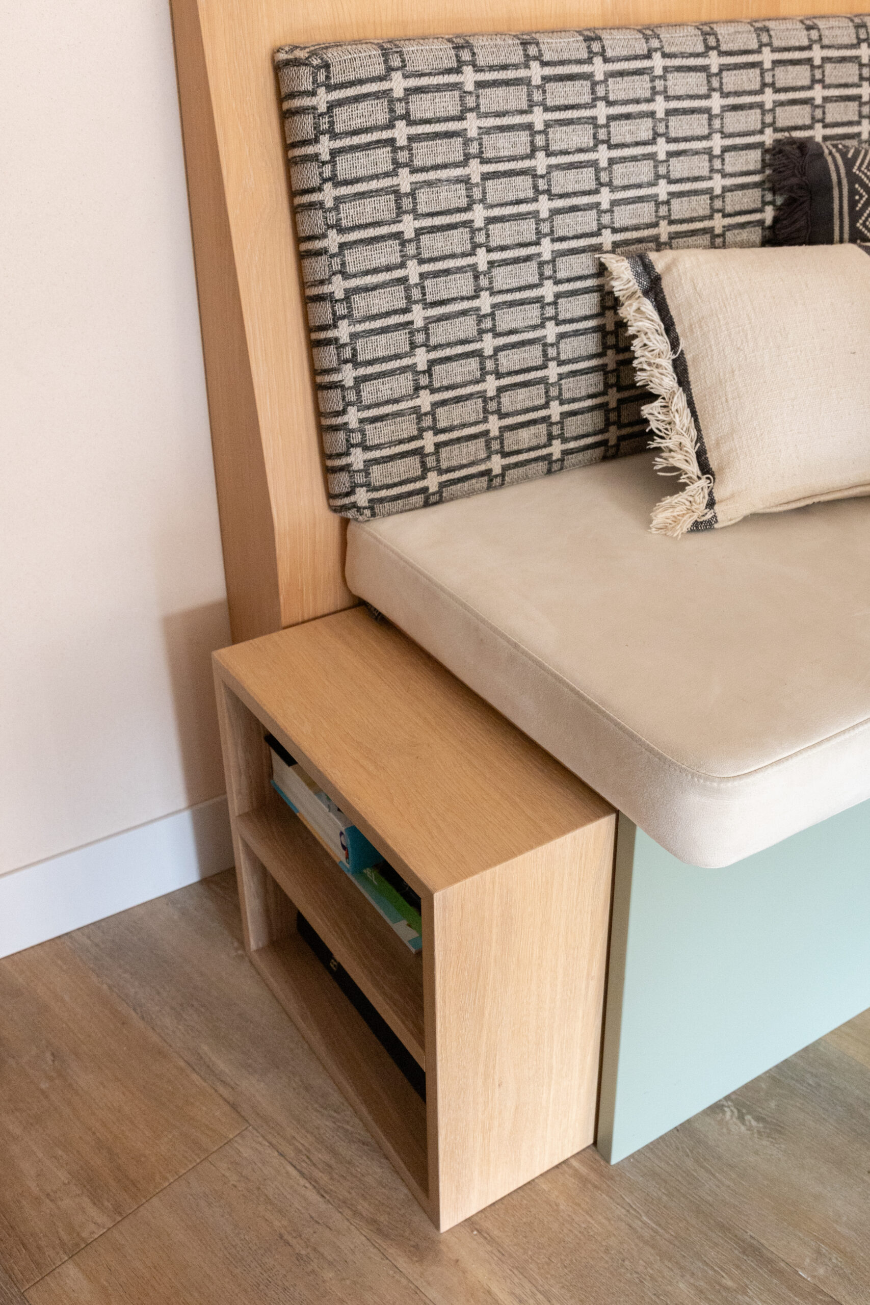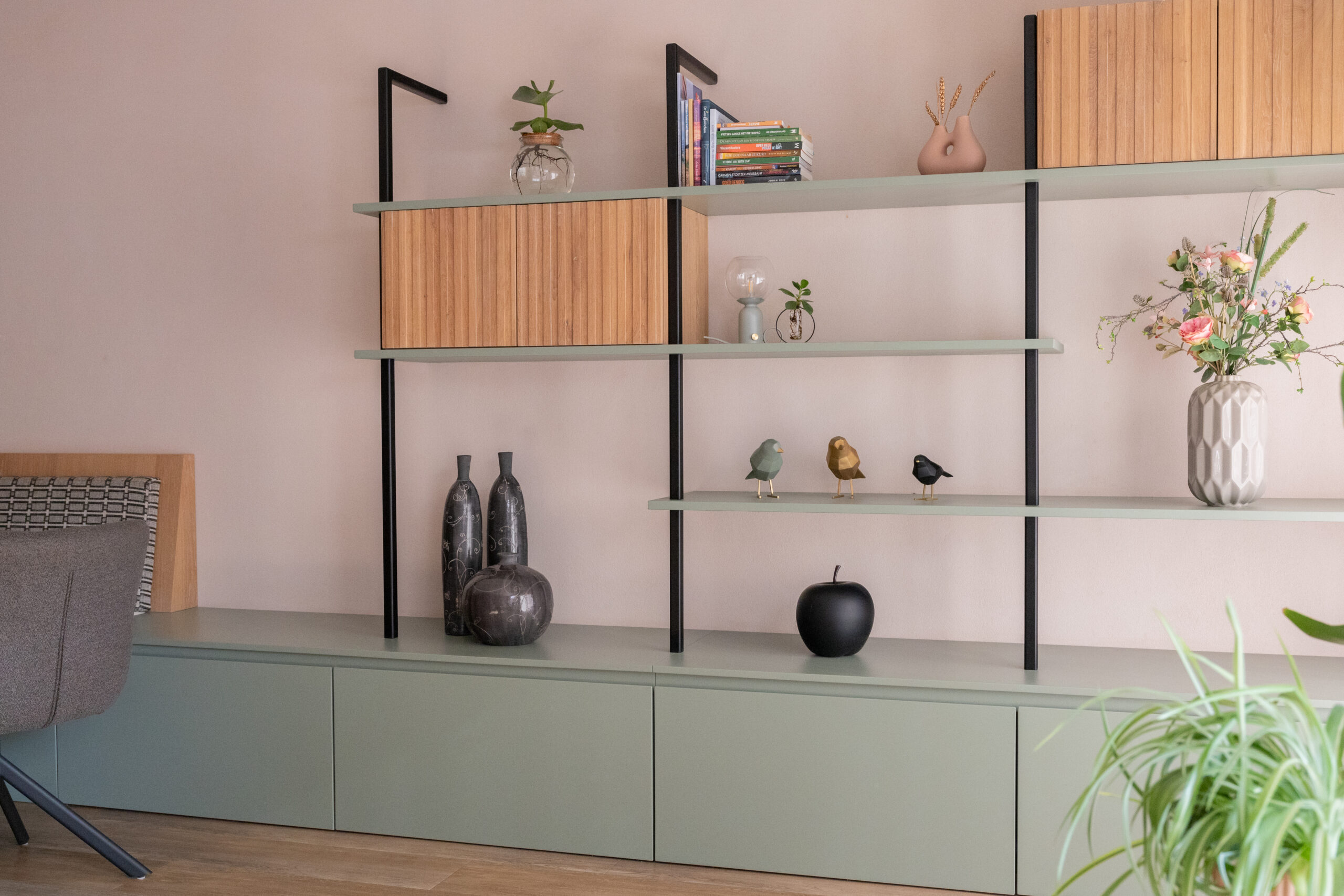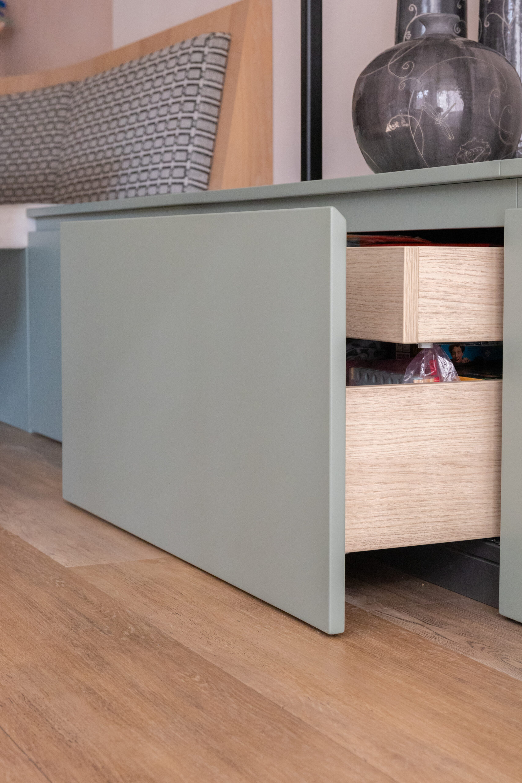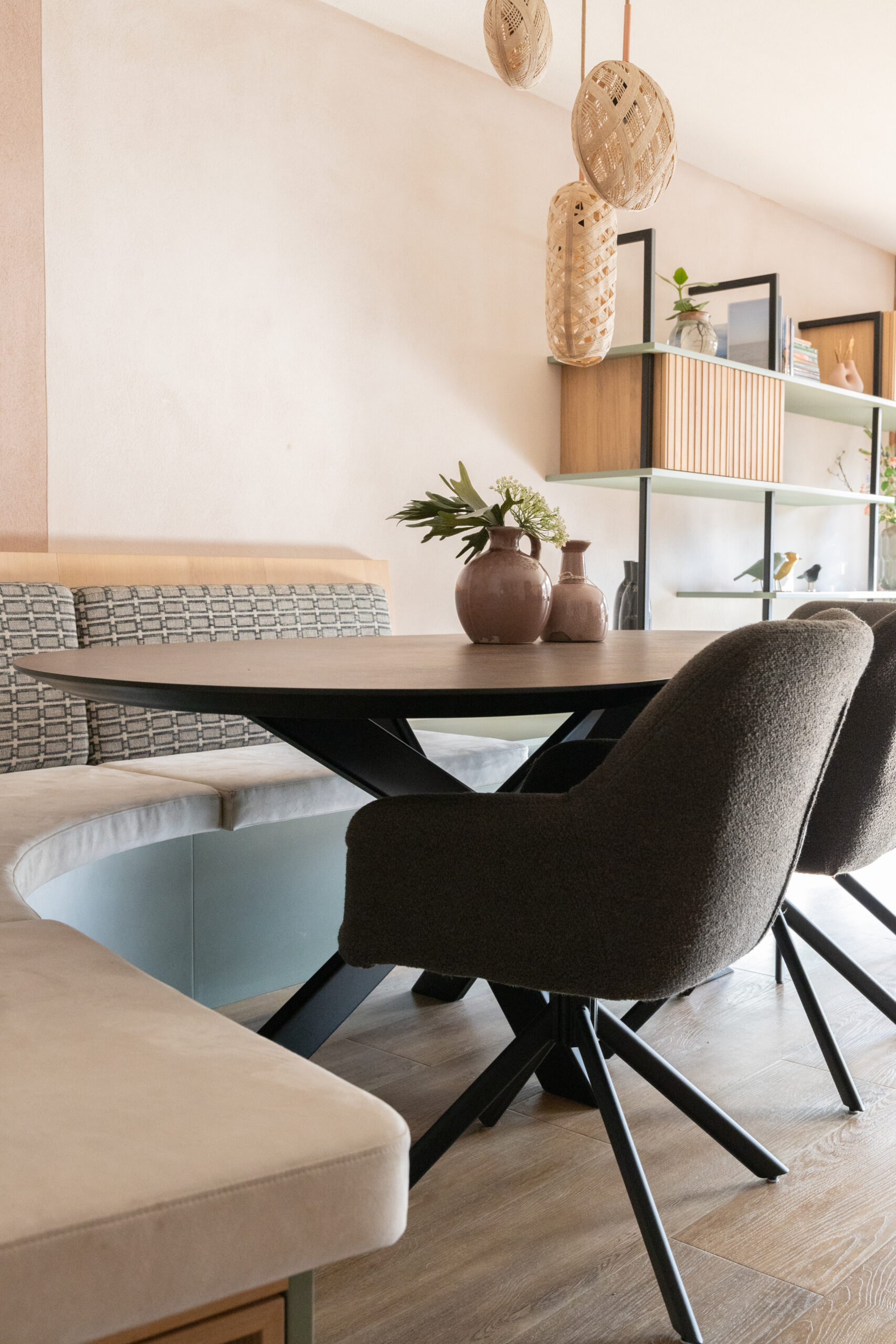 Het interieur was al een kleurrijk geheel, maar er mocht echt een statement gemaakt worden. Door een Scandinavische maatwerkkast toe te voegen aan de roze getinte wanden, creëerden we een prachtig en samenhangend geheel. Deze kast, die doorloopt in de eetkamerbank, biedt niet alleen stijl maar ook functionaliteit. Met handige opbergplekken, zoals de kleppen onder de zitkussens en de uitschuifbare zijkant, zorgen we voor optimaal gebruik van de ruimte.